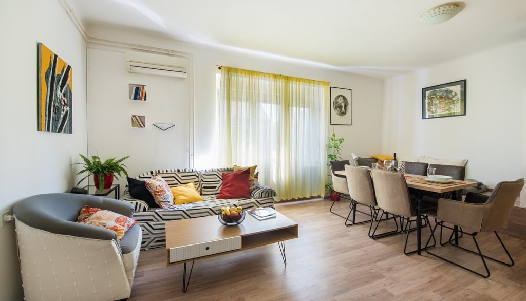 Donja etaža obuhvaća dnevni boravak, spavaću sobu, kuhinju i kupaonicu, dok se u potkrovlju nalaze tri dodatne spavaće sobe i toalet. Stan je posljednji put renoviran 2018. godine, ima etažno centralno grijanje i klima uređaj za hlađenje.
